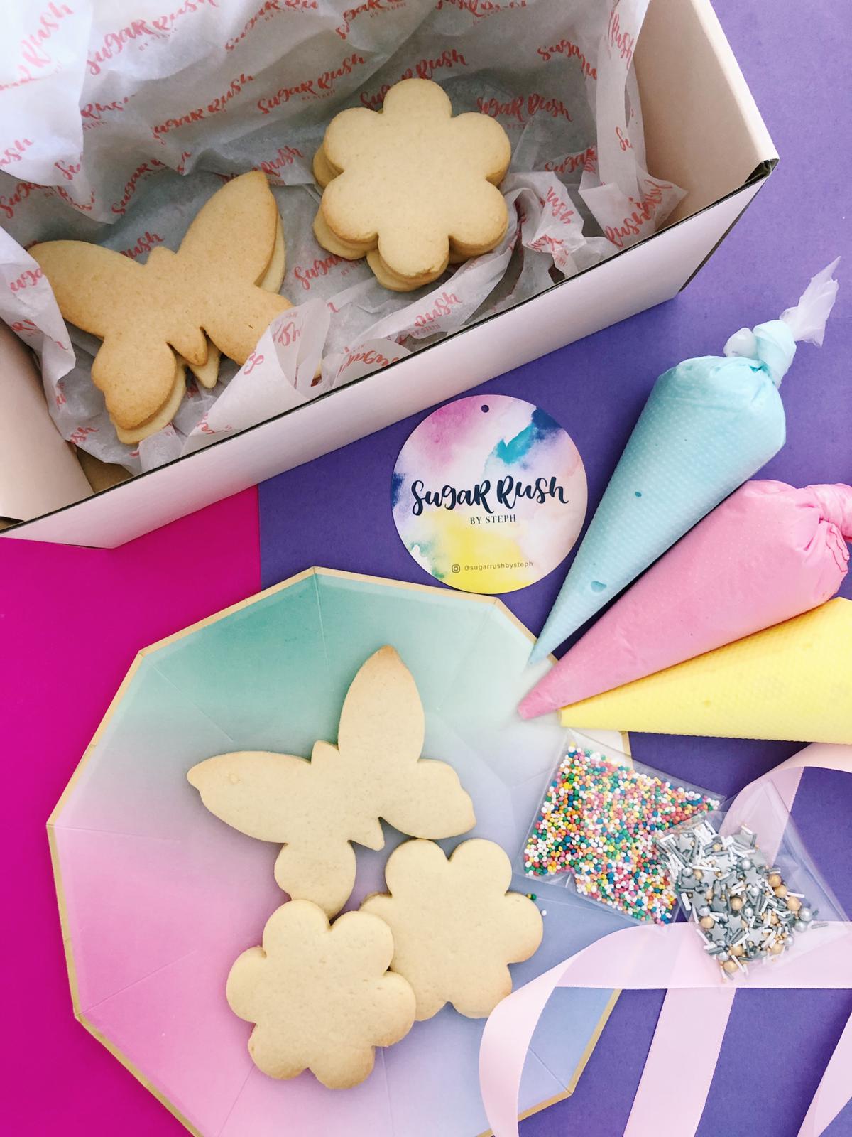 This cookie box comes in 10 sugar cookies, 2 packs of sprinkles and 3 royal icing colours, and comes in an assortment of butterfly and flower-shaped cookies.
